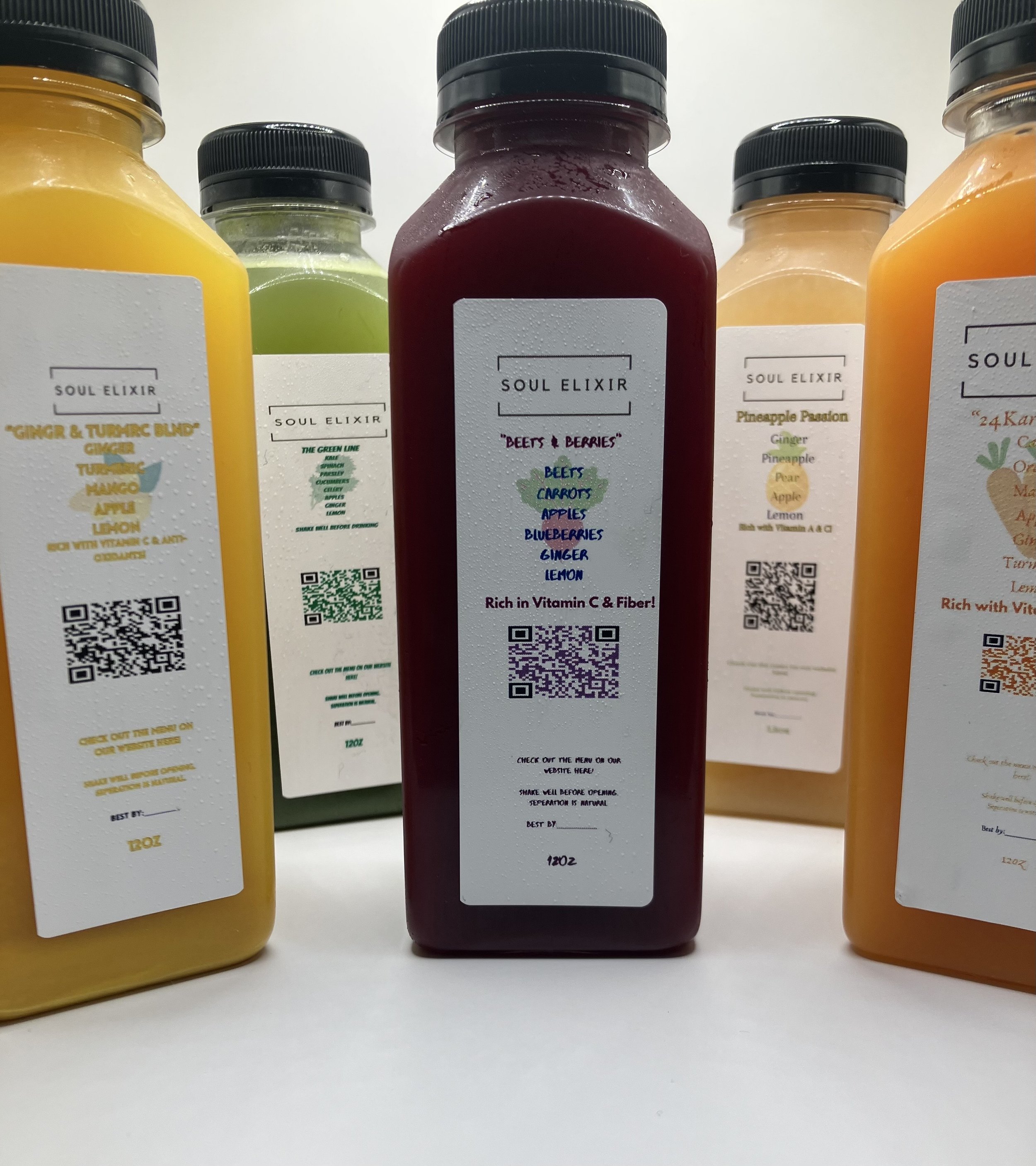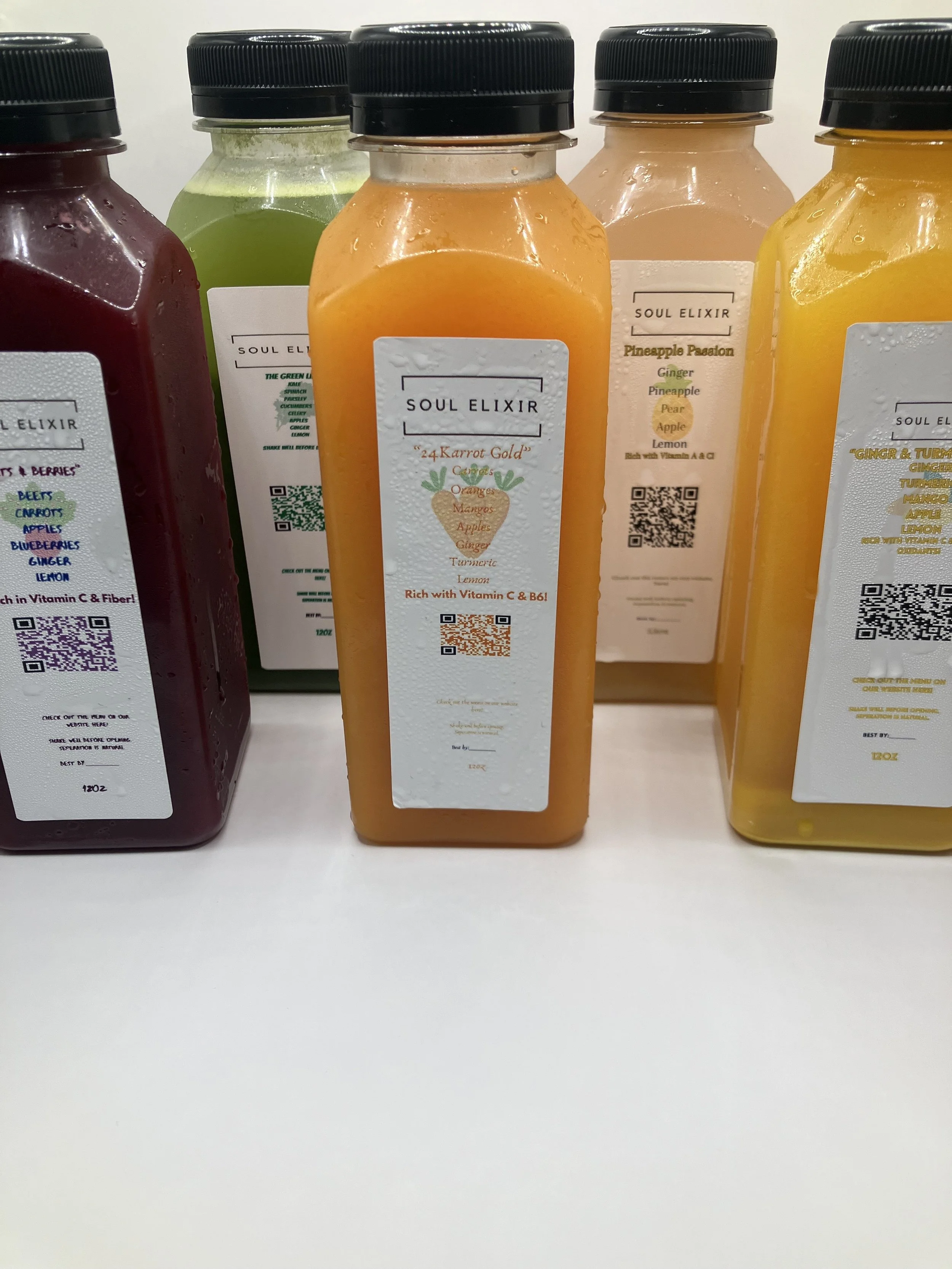 Juices 3-day juice cleanse $130.00 Add To Cart Added! 1-day cleanse $45.00 Add To Cart Added! 24Karrot Gold from $5.00 Select Size 4oz 12oz 16oz Add To Cart Added! Beets & Berries from $5.00 Select Size 4oz 12oz 16oz Add To Cart Added! The Green Line from $5.00 Select Size 4oz 12oz 16oz Add To Cart Added! Gingr & Turmrc Blend from $5.00 Select Size 4oz 12oz 16oz Add To Cart Added! Pineapple Passion from $5.00 Select Size 4oz 12oz 16oz Add To Cart Added! I've Got 5 On It from $24.00 View Options Soul Elixir Pack from $13.00 Select Size 4oz 12oz 16oz Add To Cart Added! Wellness Pack from $25.00 Select Size 4oz 12oz 16oz Add To Cart Added! Soul Elixir eGift Card from $25.00 Select Value $25.00 $50.00 $75.00 $100.00 Purchase Added!